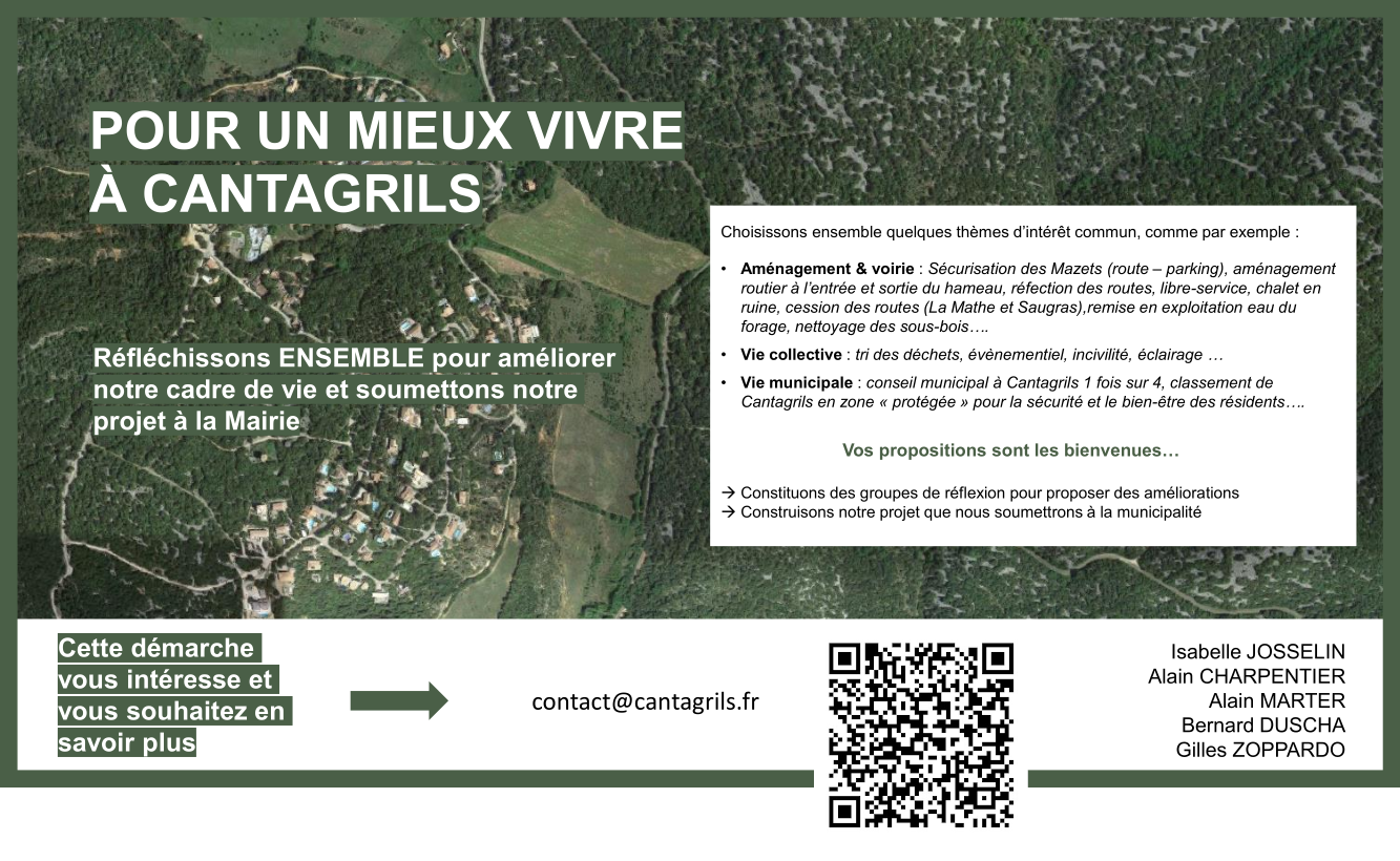 Créé en 2023 à l’initiative de 5 habitants de Cantagrils (*), le Groupe de Réflexion sur l’Avenir de Cantagrils (GRAC) en collaboration avec l’ACDC (Association des Citoyens de Cantagrils) a pour ambition de travailler sur l’amélioration de notre cadre de vie et de sa sécurité. Par le biais d’un sondage en décembre 2023 (voir ci-dessous), nous vous avons sollicités pour connaître vos aspirations. Aujourd’hui, après plusieurs réunions avec le Conseil Municipal et quelques améliorations déjà opérées (signalisation, tracé au sol pour la sécurisation des piétons), nous avons besoin que vous apportiez votre pierre à l’élaboration d’un plan de circulation et de sécurisation pour Cantagrils, rendu possible par l’acquisition – récente – des terrains de Cammingha par la Commune. Nous avons déjà proposé différentes idées d’améliorations et si vous voulez rejoindre notre groupe de travail, faites-nous le savoir par un mail à l’adresse suivante : contact@cantagrils. (*) : Isabelle Josselin - Alain Charpentier - Alain Marter - Gilles Zoppardo - Bernard Duscha |